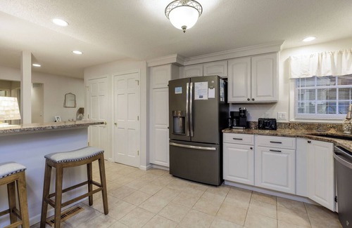 In the interior, this villa features an open floorplan, with a spacious living area and stately fireplace as the centerpiece. The kitchen has been completely updated with new cabinets, countertops, and stainless steel appliances. The dining area features seating for 6. The Primary Bedroom features a flat screen TV, a king bed, and an ensuite bathroom with a walk in shower. There is a washer and dryer in the hallway, leading to another full hall bathroom with a combination tub and shower. The guest bedroom also features a flat screen TV as well as two twin beds.