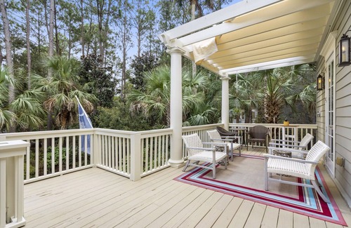 This Kiawah Island vacation rental offers 3 bedrooms, a private saltwater pool, a 6-person hot tub, a spacious deck, and a tranquil screened porch. Conveniently located on Governors Drive, the main thoroughfare in Vanderhorst Plantation, the home is a 7-minute bike ride to the nearest beach!