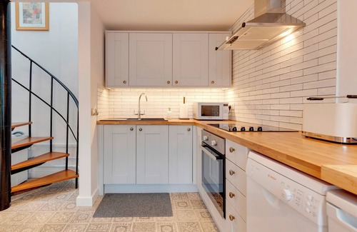 The modern kitchen is generously sized, and fully equipped for home dining. Use of appliances include an oven, electric hob, small fridge-freezer and dishwasher. Smaller appliances include a microwave, toaster, kettle, with some condiments provided. There is also a washing machine available for personal use.