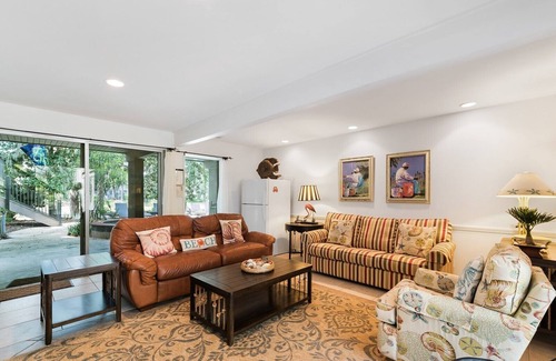 From the main upper level, there is a staircase that descends to the ground level. On this lower level is another family room with a Queen sleeper sofa, 50" TV and extra refrigerator. This living room has sliding glass doors that lead to the nicely landscaped pool and hot tub. There are three bedrooms on this level. The first is located to the left of the family room and is considered a second Master with a king bed, 36" TV and a private bath with the standard shower/tub combination. The other two bedrooms are located off of a hallway to the right of the living area. They both share a bathroom with the shower/tub combination that is accessed from the hallway. One bedroom has two queen beds, 32" TV and sliding glass doors to the pool area. The other bedroom has three twin beds and 25" TV.