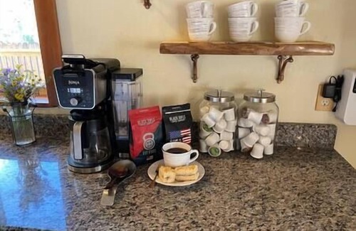 Our fully equipped kitchen includes the latest in modern appliances, granite and butcher block countertops, a farmhouse-style sink, and a comprehensive selection of cookware. Whether you're preparing a homemade breakfast before a day of adventure or savoring a romantic dinner for two, our kitchen and outdoor gas grill will meet your culinary needs.