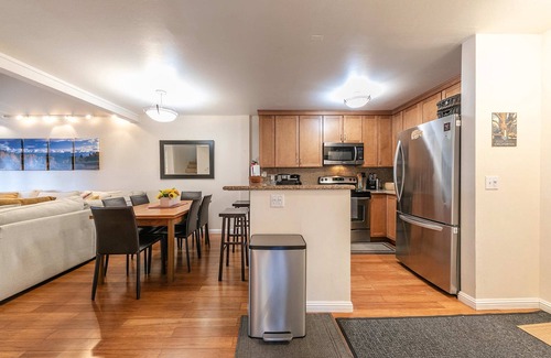 For those looking for an inviting alpine escape, this bright condo is perfect for you! The home welcomes you with a fully equipped kitchen just steps from the front door. The kitchen features everything you need to prepare home-cooked meals, with a kitchen bar and 3 barstools, and a 6-person dining table offering ample space to gather for meals with your group. The bright living room is ready for entertaining or relaxing with a plush L-shaped couch, a Smart TV, and a range of board games to enjoy. Have a group movie night while you warm up by the pellet stove, or step out onto the balcony and take in the fresh mountain air.
