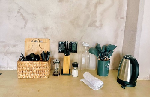Fully equipped kitchen with an electric stove, cookware, full dinnerware set, and a French press so you can enjoy authentic Oaxacan coffee without leaving your loft