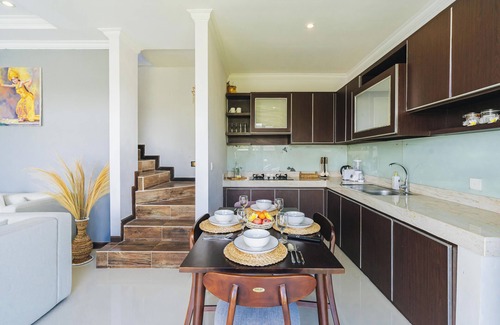 Nestled in the tranquil heart of Sukawati, Bali, Villa Griya Purnama is a private escape designed for those seeking peace and relaxation. Surrounded by lush rice fields and tropical gardens, this charming two-bedroom retreat blends modern comforts with Balinese elegance, offering a truly serene getaway. Each spacious bedroom features a king-size bed, air-conditioning, and an en-suite bathroom complete with a bathtub, shower, and complimentary toiletries. Thoughtfully designed for comfort, the villa offers two inviting living areas—one upstairs with a scenic balcony and another downstairs—providing ample space to unwind. The fully equipped kitchen and dining area for four make it easy to enjoy home-cooked meals with loved ones.