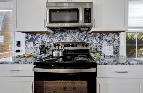The Main bedroom upstairs has it's own private entrance to the glassed in porch and it's own private bath. Two other bedrooms upstairs sleep 4 each and share another full bath. Seating area upstairs as well to read a book, share some alone time or with others if everyone doesn't want to be together at once! One bedroom downstairs sleeps 3 and has it's own entrance to the full bathroom on the first level. Separate large laundry room off the kitchen. Very short walk to the beach which is located on the first street that allows access to Point St. For those visiting for the first time to Edisto Beach, Point St. is a very sought after vacationing location that is between Palmetto Blvd and the beach. This section is not paved and has a lot less traffic than Palmetto Blvd. Fronts on Point St. so no crossing a busy 4 lane to get to the beach! Large lot with grassed area and ample parking. Charcoal grill for those cookouts and dining table up on the sundeck to sit and enjoy your meals! Come and enjoy your beach vacation here and we know you will want to return!