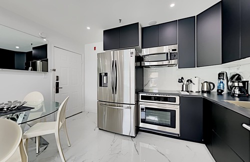 Kitchen: Fully Equipped Kitchen with Stove cooktop, Over-the-counter Convectional Microwave Oven, Fridge-Freezer, Dishwasher, Coffeemaker, Toaster, Blender, Pots & Pans, Cooking/eating utensils, Iron, Ironing-board, Ice-Bucket, Wine Glasses, Bar Top Dining Table with chairs.