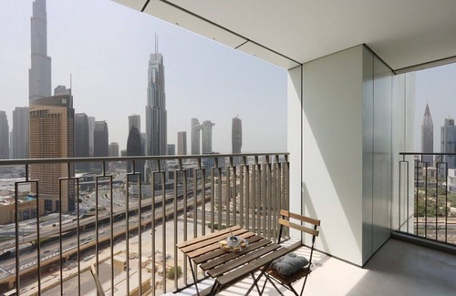 - Balcony and windows feature stunning views of the Burj Khalifa.