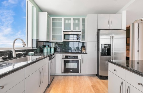 The Master Bedroom has a comfortable King size jumbo mattress with a memory foam topper, and a large window with a beautiful view of the beach. Automated shades, as well as blackout curtains for a perfect night's sleep. It also includes a wall mounted 75" TV. The en-suite master bath includes a large walk-in closet equipped with an iron and ironing board, double sinks, a jetted tub, and a separate shower. All designed with marble floors and counters.