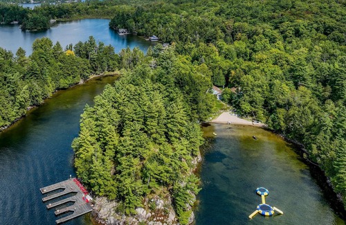 Cottage in Muskoka with Waterfall - North - Nestled amongst two private bays on Lake Rosseau, this Muskoka showstopper is compromised of two separate sleeping quarters! They can be rented together or individually. This one-of-a-kind property offers ultimate privacy and numerous outdoor areas for a multi-family cottage getaway. Surrounded by two separate sandy beach bays, the Cottage in Muskoka with Waterfall - North is also equipped with two boat docks. The Cottage in Muskoka with Waterfall - North's most unique feature is the 20' waterfall that overlooks the tennis and basketball court on the property.