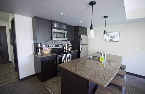 An open concept kitchen and living area with large windows offer a terrific, bright space for relaxing after spending a day exploring the Rockies. With 1200 square feet of living space and five beds, it is an ideal accommodation choice for families or groups. After a day of hiking/fishing/mountain biking or skiing or snowboarding, come back and enjoy your peaceful retreat. The welcoming condo overlooks the resort's courtyard and offers mountain views from your balcony. Fast Wi-Fi, 2 flat screen TVs, DVD player and access to shared hot tub are also included.