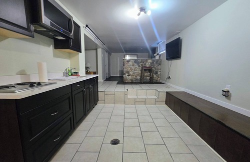 Downstairs, you’ll find an additional living area with its own TV (also with a Fire Stick and YouTube Premium access), a bar, and a convenient kitchenette — perfect for extra space to unwind.