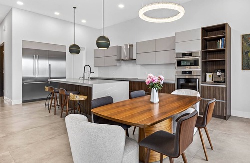 Designed with comfort and elegance in mind, the open-concept floor plan boasts soaring 12-foot ceilings, floor-to-ceiling windows, and luxurious finishes throughout. The expansive kitchen is a chef’s delight, featuring high-end appliances, quartz countertops, Italian cabinetry, and an oversized island perfect for entertaining. The airy great room flows seamlessly to the balcony overlooking your private heated/cooled saltwater pool and spa.