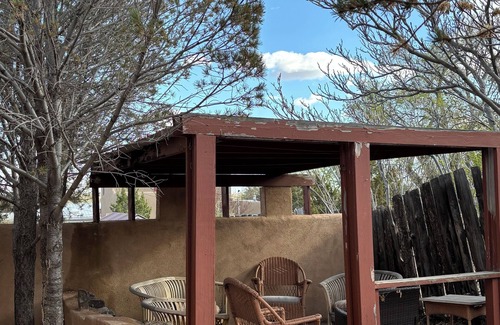 Your home away from home in Santa Fe with 3 bedrooms, 2 full baths. This awesome house features 1 king bed and 2 queen beds, perfect for a group getaway. Enjoy the welcoming living room and den, both with comfy sofa beds for extra guests. With amenities like washer/dryer, kiva wood-burning fireplace, BBQ, a hair dryer, AC, outdoor eating areas and heating, your stay will be nothing short of phenomenal. Close to grocery stores, dining and parks. 2.2 miles to Santa Fe Plaza downtown. 40 mins to Los Alamos, 17 miles to Santa Fe Ski Basin.Totally fenced with feeling of a family compound. Dog friendly subject to prior notice and payment of $100 non-refundable cleaning fee. Close to Santa Fe Trail, a multi-use trail that goes almost to Vargas Mall, through multiple parks and past restaurants and shopping.