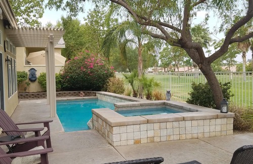 Beautiful 3 bedroom, 2 bath home with pool & hot tub within the Indian Palms Country Club gated community. Master bedroom features queen size bed with walk-in closet, private bath with double vanity bathroom walk-in shower and jetted tub and private patio. 2nd bedroom features queen size bed, adjacent bathroom. 3rd bedroom ideal for guests and features queen sized bed, and separate sleeping alcove with twin & single bunk beds. Kitchen features granite countertops, gas appliances and open floor plan to dining & living areas. Dining table easily seats 8 and living room features 65" TV and views to back patio pool, hot tub and golf course.