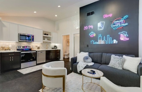 Discover themed charm in our 3 separate apartments in the same building that each have 1BR, 1.5BA in vibrant East Nashville. Each unit has unique decor and modern amenities, take your pick of our NashVegas, Jungle or Mid-Century Modern themed units. A convenient location directly across from The Wash with six independent eateries and a cocktail bar and a perfect hub for exploring the city's hotspots. Perfect for a couples trip. Book your stay now!