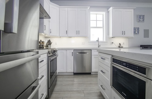 The spacious kitchen is fully equipped with quality Bosch stainless steel appliances, allowing you to prepare any meal, from a simple breakfast to a gourmet lunch and dinner. Ample countertops and a central island offer plenty of space to cook and experiment like a Michelin-star chef. NEW Stainless Steel Bosch appliances adorn the kitchen.