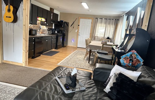 Arcade games~Darts~wall tic-tac-toe & connect 4~Board Games ~Puzzles~Snacks & beverages~S’more’s supplies~Internet~washer/dryer~coffee~cocoa~tea~futon for extra sleeping(keep in mind, 1 bathroom)