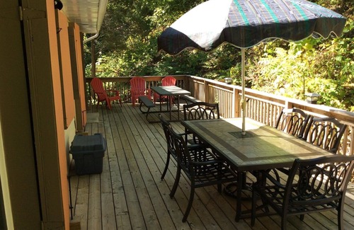 Comfortable Muskoka chairs and picnic table with umbrella on outdoor decks. All under a beautiful canopy of Savvanah Oak trees and nestled within a beautiful bluffs.