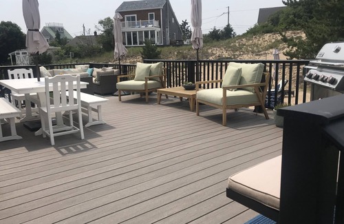Spacious outdoor deck area with all-weather farmhouse table for 8 guests, outdoor fire pit with plenty of fire wood, Weber gas grill with side burner, comfortable outdoor patio furniture. Large, private backyard with a variety of entertaining outdoor yard games and twinkle lights. Enclosed outdoor shower and outdoor double sink. Garage is stocked with 5 adult bikes, beach chairs, beach towels, umbrellas and many beach and outdoor accessories.