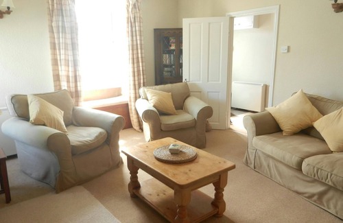 Living room: 3-seater sofa, 2 armchairs, pouffe, Freeview TV/DVD, sea views