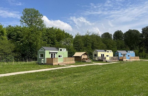 This trio of Tiny Houses is clustered on the edge of a large play-sports ground in the middle of nature and can accommodate groups of up to 21 people(max 14 adults). A perfect place for 3 or 4 families. And you also get free use of a Safari sleeping tent with hotel-quality beds to accommodate everyone while still having enough living space. Pairing outdoor picnic tables allows everyone to eat outside together and create an intimate feel in the great outdoors, after which you can build a campfire, dive into the pool or hit the spa!