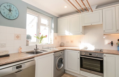 The living areas in this reverse-level home consist of a first-floor open-plan living space with kitchen, dining area and sitting area with electric oven and hob, microwave, fridge/freezer, washer/dryer, dishwasher, TV with DVD player, a selection of books, a woodburning stove, and a balcony with furniture. The bedrooms are on the ground-floor and consist of two king-size rooms, one of which has a TV and zip/link feature, both of which are serviced by a bathroom. Outside there is a front patio with furniture, and designated parking for one car. Two well-behaved dogs welcomed, but sorry, no smoking. WiFi, fuel, power, bed linen and towels are all included in the price, along with a highchair and travel cot. You'll find a shop, pub and the beach in 0.3 miles. 3 West Park Mews is a delightful dwelling for a family break to Devon.