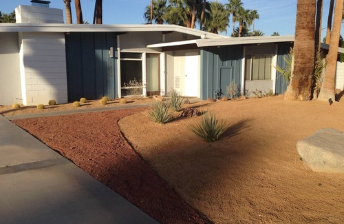 Designed by the architectural team of Palmer & Krisel and built in 1958 by Alexander Construction, this home has been fully updated inside and tastefully decorated with a combination of vintage and modern furnishings. The open living space includes a cozy sitting area with a large flat screen television, a fully equipped kitchen that will please even serious cooks, and a dining area that can easily seat 8 or 10 people. Off the home’s main hallway are three bedrooms, including a master suite and adjacent bathroom with tub and shower, plus a second bathroom with a glass-enclosed stall shower, all newly updated and spotlessly clean.