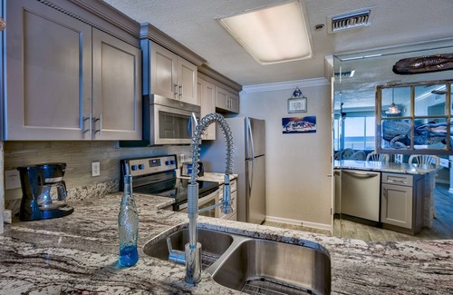The condo is decorated in a sophisticated color palette with original artwork. The kitchen is stunning with beautiful granite tops and gray shaker cabinets and it is well appointed to prepare meals for your family. The counter-height bar has three swivel stools plus seating for four at the table. There is a full-sized washer and dryer in the condo.