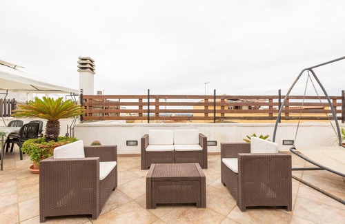 In addition to the big furnished terrace, the apartment is equipped with accessories such as air conditioning, internet, electric oven, microwave oven, hair-dryer, tv and dvd player, stereo, heating system.