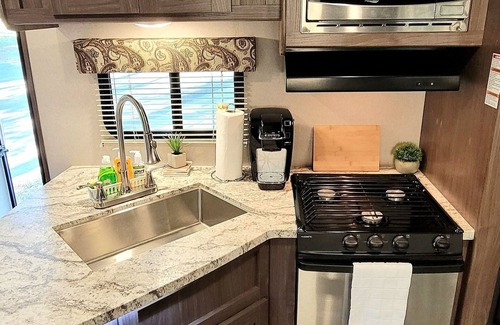The RV is a 32' 2018 Keystone Hideout 28BHS. Sits in a quiet and peaceful subdivision with friendly neighbors. It has all the luxuries of a single home with hot water, a/c and heater, wifi, and full kitchen. 5min bike ride or 15min walk to a public park with water access. Located in a desired area of Fort Walton Beach, just a short drive to town for shopping (Publix, walmart, CVS, etc), the beaches (Destin-12mi/Okaloosa-7mi/Navarre-19mi), and VPS Airport (5mi). The RV is situated in the front corner of the host's property with lots of trees and a fence to make you feel like you have your own private space. There is an outdoor area with a picnic table, lights, and fire pit to add an outdoor campsite vibe.