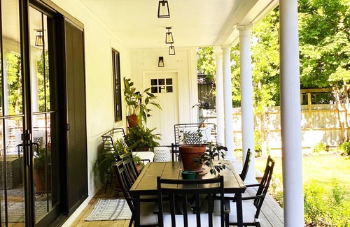 The design of the Emerson House is inspired by elements that were an essential part of the original building, such as the wood beadboard wainscot and cabinets and the high ceiling with beams and heavy trim work. The decor is inspired by a large set of vintage "Blue Willow" china that was left behind, reflected in the kitchen's color scheme, modern fabrics that harken to the same feeling, and an array of china as wall decoration. Furnishings include a mix of antiques and new furniture. Once stripped of all of the lateral windows, new windows have been installed, including a 16-foot long four-panel door in the living room, leading to a covered deck and a good-sized fenced yard. Once possessing a catering kitchen, it still has a 10-burner, two commercial oven ranges, plus a plethora of new appliances. A large dining area, with a wide sideboard and a bar, includes a 12-foot-long table (an original to the building). All wiring and lighting have been updated, and the main space is air-conditioned.