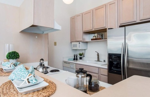 The beach is found not only within a 2 minute walk out the door, but also inside the condo, with seaside décor and motifs that's are a nod to the nearby shore as well as Monterey’s long history as a shipping and fishing port. The white painted high vaulted ceilings make this condo feel spacious and there is little or no sound from neighboring units, only the sound of the ocean waves.