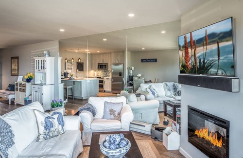 This ocean-side 1-bedroom 1-bath condominium nestles against the sand dunes on Del Monte beach in Monterey. From your living room and wraparound deck, enjoy a panorama of pelicans, otters, dolphins and vast shoreline views wrapping around the bay.