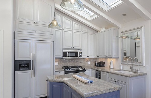 A charming gate welcomes you onto a comfortably furnished stone patio. Entering the split level home, you’ll discover an abundance of skylights and windows. Up several steps, there’s a spacious great room that includes the living and dining room, and flows into the kitchen. The living room features modern furniture, a 75” flat-panel TV and skylights with shades controlled by remote.