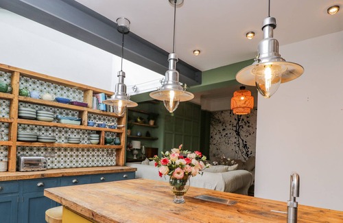 Amenities: Gas central heating with open fire and underfloor heating in the kitchen. Gas range, microwave, American-style fridge/freezer, washing machine, tumble dryer, dishwasher. 65" Smart TV, TV, WiFi, selection of books. Fuel, power and starter pack for open fire inc. in rent. Bed linen and towels inc. in rent. Roadside parking. Rear garden with gravel, patio, shed for bike storage, and hot tub. One well-behaved pet welcome. Sorry, no smoking. Shop 0.1 miles, pub 0.4 miles. Note: Guests can drop off luggage, parking can be found just a short drive away. Note: This property will accept stag and hen parties