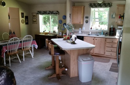 Our home is an ideal getaway for couples and small families. The home includes all utensils for cooking, a 50" Smart television, 400mb/s wifi and is perfect for vacation getaways and remote office work. The kitchen is stocked with everything a family should need. There is wood flooring in the living room and the super comfy couch is down filled and sits next to the leather recliner. There is a gourmet Egg style BBQ and separate smoker on the back deck and the kitchen appliances are stainless/black. The stovetop is a glass electric and there is a microwave, coffee maker and toaster and slow cook crock pot.