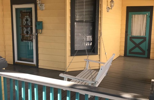 This is an updated 1.5 story house from 1904. There are 2 downstairs bedrooms-1 king, 1 queen- and full bath off living room. Upstairs is one large room with queen bed and (funky) full bath and additional cubby area with sleeper futon. Additional floor mattress available. Guest limit of 7 adults. Eat-in kitchen, full-sized washer and dryer, fantastic front porch with swing, small back deck and patio. There is a driveway for parking 3 cars or 2 SUVs.