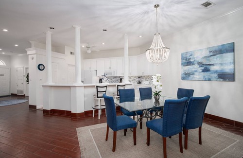 Decorated in chic coastal style, our villa offers an open entrance foyer and a sunny dining/family area with french doors to a screened porch. The spacious family room features comfy seating and an HDTV. Our gourmet kitchen is fully stocked with all the cookware and dinnerware needed to prepare a delicious meal.