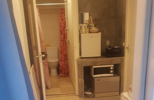 This is why even making easy meal and eating are possible, but it will not be comfortable, especially if you stay as 2 persons. There is no comfortable space for eating and no comfortable space for cooking since the place is very very small. Most of my guests, most of the time, buy food and eat outside. However the possibility to make easy meals and eat using folding table is there Which of course will be appreaciated during bad weather.