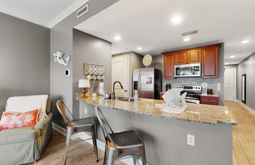 Inside your stay, this third-floor condo boasts a sunny living room with comfortable sofas surrounding a smart TV. When hunger arises, the fully equipped kitchen features stainless steel appliances and everything you could possibly need to whip up tasty meals and treats for the crew. When you'd prefer to cook alfresco, head for the shared grilling area.
