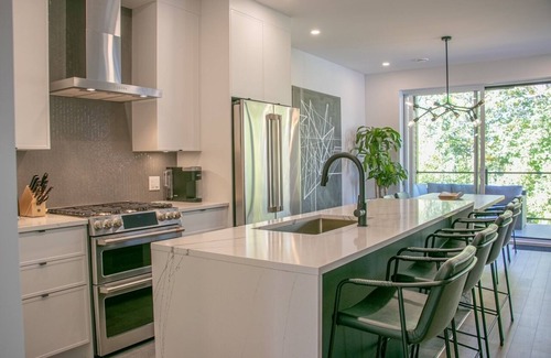 Equipped with a gas range, fridge/ freezer including water /ice maker, dishwasher, microwave and washer / dryer.