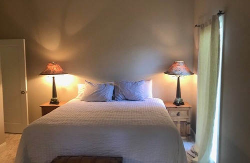 Enter the house through the garage and walk into the "Bonus Bedroom" which has a Queen Bed and Twin Trundle Beds. Laundry is located in the closet in here. There is no door, but walk up 6 stairs to the eat-in Kitchen with dining table for 8. Foyer and Front Door (house is located on a hill) and features 1st Floor Primary Suite with king size bed, patio & full Bathroom.
