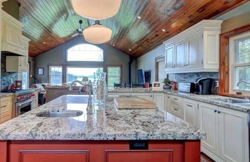 CUSTOM GOURMET KITCHEN WITH LOVELY BREAKFAST NOOK OVERLOOKING LAKE ROSSEAU, FEATURING GRANITE TOPS & LARGE ISLAND.