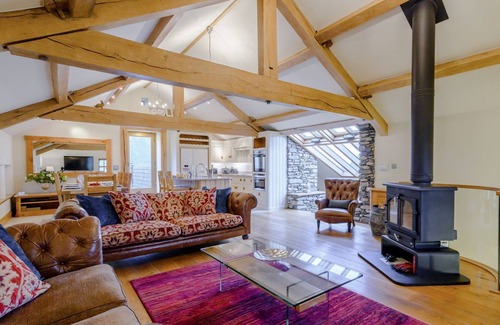 Living room 2: 48" Smart TV, DVD Player. Ground source underfloor central heating, electricity, bed linen, towels, Wi-Fi and logs for wood burner included. Travel cot and highchair available on request.. Patio with garden furniture and BBQ. 500 acre grounds with woodland (shared with other properties on-site). Hot tub for 6 (private). Private parking for 4 cars. No smoking. Please note: Sorry, no hen or stag parties and the property has a natural water supply from a borehole. There is an unfenced lake, 200 metres from the property.. Mungeon Barn is part of a family run holiday estate nestled in the South Lakes village of Backbarrow, this 5* luxury resort is the perfect place to spend time with your loved ones! The Barn is detached, offering four spacious bedrooms, with the master boasting an en-suite and monsoon shower. There is a family bathroom with bath, shower and toilet and a further shower room all located on ground floor. This upside down barn offers a contemporary first floor open plan living/dining/kitchen area and a wood burner, and a second living room with a TV and DVD player. Outside is a private hot tub, barbecue area and courtyard.