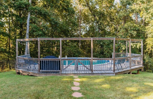 This home is a spacious 4-bedroom, 2.5-bath house on 3 wooded acres in a peaceful neighborhood with access to multiple lakes. It sleeps up to 12 people with 2 king beds, 1 full, 3 twins, a queen sofa bed, and a couch, so it's perfect for families and large groups. Enjoy the pool, playset, trampoline, and firepit. The home also features full kitchen and laundry, a cozy breakfast nook, and a spacious dining room. Take in some great views as you walk our calm streets with little to no traffic.