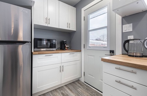 The kitchen is well equipped with a Keurig coffee maker, dishes, cutlery, and pots/pans set.