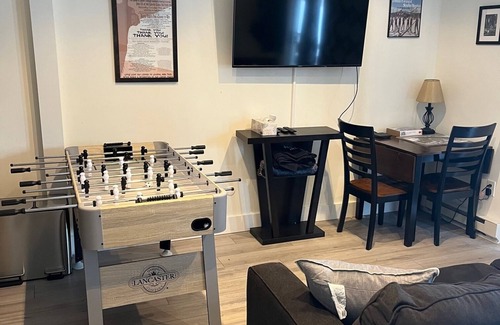 With four bedrooms and two baths, this unit provides the space that you need without base area prices and just a four minute drive to the lifts. Our home is great for a large family or two families traveling together. Two bedrooms are upstairs and two are downstairs, offering privacy and space. Two sets of bunkbeds in the house make for a fun time for the kids, and our daughters personally decorated the upper floor bunk room. The main floor has a full kitchen, dining area, and living room. The living room fireplace has been recently updated. The deck features patio furniture and a gas fire pit. The Ground floor includes plenty of space for gear storage, a foosball table and wall-mounted TV.