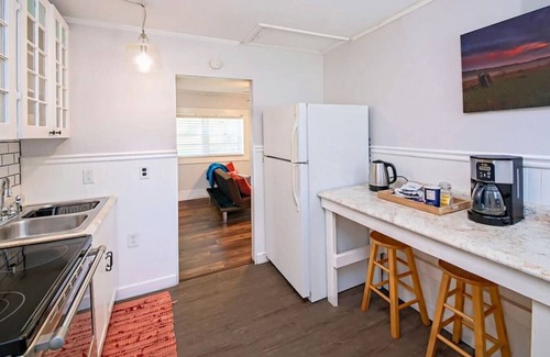 Cottage C: Studio style, with new queen bed, SmartTV with Roku, new bar area for eating and preparation, full kitchen with mini-fridge, and full bathroom with shower. Window A/C unit provides cool air throughout.