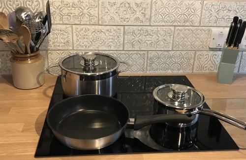 The kitchen has an extending dining table, which seats up to 6. There is a Zanussi fan oven, induction hob, dishwasher, washing machine, microwave and plenty of good quality knives, cookware, utensils and crockery so that you can happily cook your own meals.