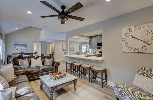 You can practically feel the sand between your toes! This Palmetto Dunes island beauty is at the end of the beach path, so you’re just a few flip-flops or barefoot steps to the ocean and fun in the sun. The first-floor living area has a beautiful open floor plan with 3 bedrooms, all with their bathroom, a stunning island blue kitchen, and a spacious dining area. Upstairs, you will find a bunk room, a bedroom with 2 queen beds, and a full bath. Outside this main living space awaits your secluded, private pool and deck surrounded by moss-draped live oaks and palm trees. There is plenty of room to lounge in this patio space, which is perfect for grilling out and entertaining.